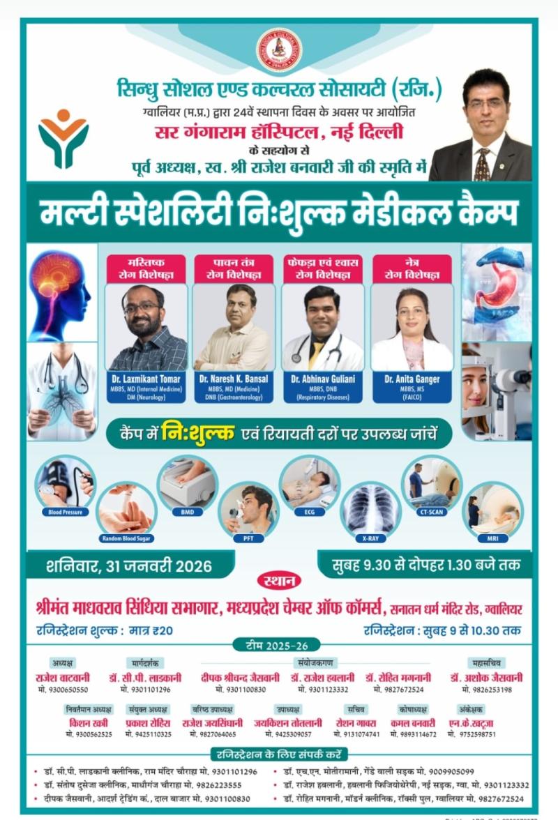 ग्वालियर। सिंधु सोशल एंड कल्चरल सोसायटी द्वारा पूर्व अध्यक्ष स्व. श्री राजेश बनवारी जी की स्मृति में संस्था के 24वें स्थापना दिवस के अवसर पर दिनांक 31 जनवरी 2026, शनिवार को प्रातः 9:00 बजे से दोपहर 2:00 बजे तक सर गंगाराम हॉस्पिटल, नई दिल्ली के सहयोग से मल्टी स्पेशलिटी निःशुल्क मेडिकल कैम्प का आयोजन किया जा रहा है। इस कैम्प में सर गंगाराम हॉस्पिटल, नई दिल्ली से चार विशेषज्ञ डॉक्टर विभिन्न बीमारियों के उपचार हेतु उपस्थित रहेंगे, जिनका विवरण इस प्रकार है—