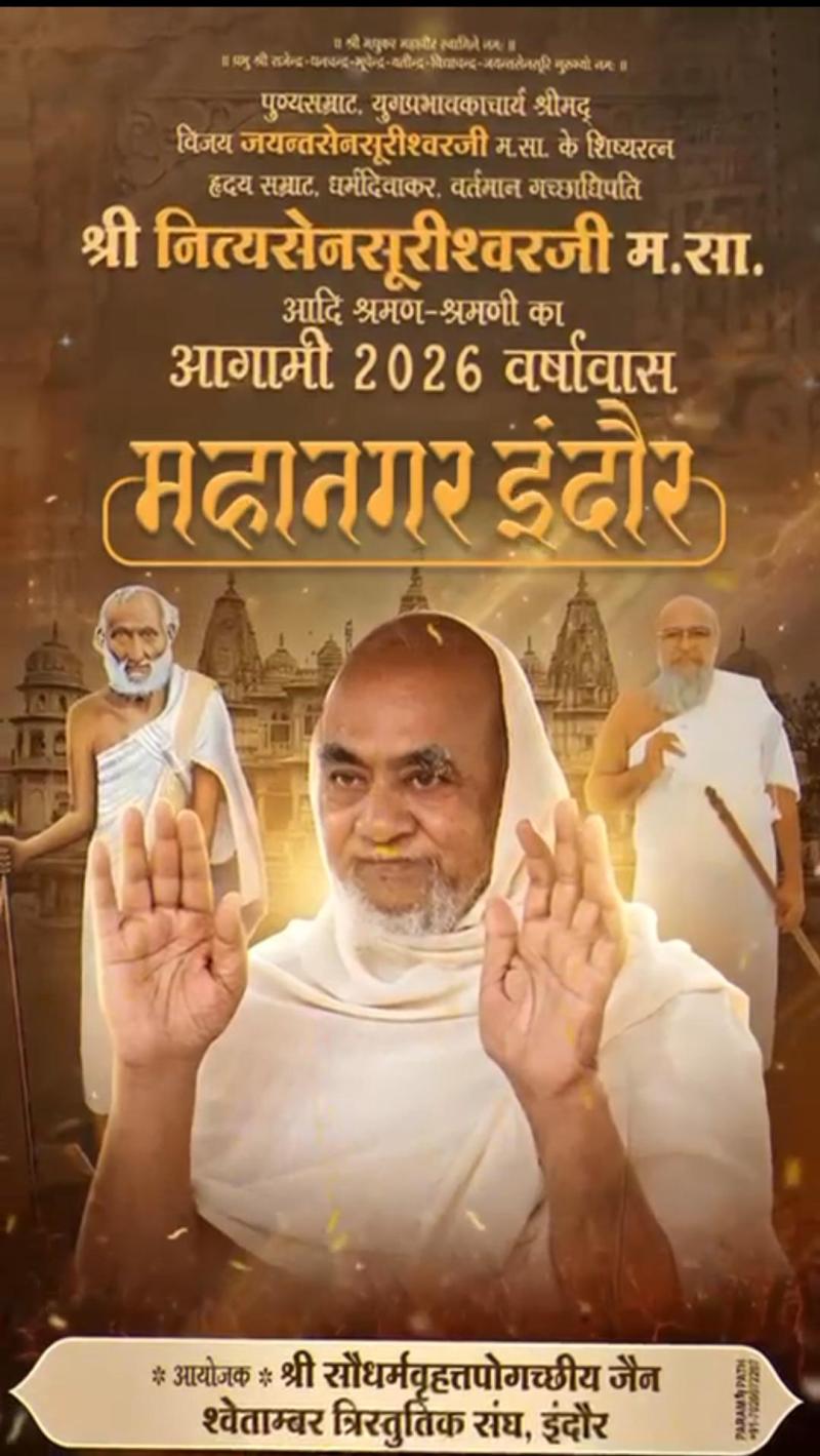 धर्म दिवाकर हृदय सम्राट आचार्य श्री नित्यसेनसूरीश्वरजी म.सा. का वर्ष 2026 का चातुर्मास इंदौर (म.प्र.) में.