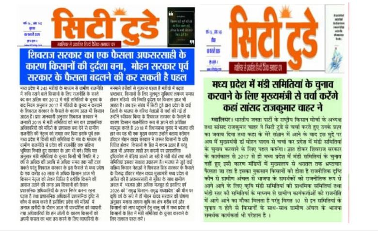 मध्य प्रदेश के सर्वहारा वर्ग के लिए संकल्प के साथ जो कहा वह किया करने वाले मुख्यमंत्री डॉ मोहन यादव ने वर्ष 2027 किस वर्ष बनाने का निर्णय किया था इसी के तहत 2017 के बाद सहकारी तथा मंडी चुनाव न होने की स्थिति को दैनिक सिटी टुडे समाचार पत्र द्वारा 5 फरवरी 2026 को प्रकाशित समाचार शिवराज सरकार का फैसला अफसरसाही के कारण किसानो की दुर्दशा नहीं हुए मंडियों तथा सहकारी समितियों के चुनाव के बाद 8 फरवरी को भाजपा राष्ट्रीय किसान मोर्चा के अध्यक्ष सांसद राजकुमार चहर से जब सिटी टुडे द्वारा मध्य प्रदेश में सहकारी समितियां तथा मंडीयो के चुनाव बावत प्रश्न के माध्यम से ध्यान आकर्षण कराया गया था तब श्री चार ने कहा था कि इस संबंध में राष्ट्रीय स्तर व तथा मुख्यमंत्री से चर्चा करूंगा।